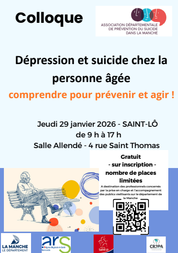 L’Association Départementale de Prévention du Suicide de la Manche (ADPSM), le Projet Territorial de Santé Mentale Manche (PTSM) et le Centre de Ressources Interrégional en Psychogériatrie et Psychiatrie de la Personne âgée (CR3PA) se sont associés pour vous convier à un colloque à destination des professionnels (salariés et bénévoles) concernés par la prise en charge et l’accompagnent des publics vieillissants sur le département de la Manche, le jeudi 29 janvier 2026 de 9h à la Salle Allendé de Saint-Lô – 4 rue Saint Thomas sur le thème (programme ci-joint, affiche en 1ère page et programme en 2ème page) :