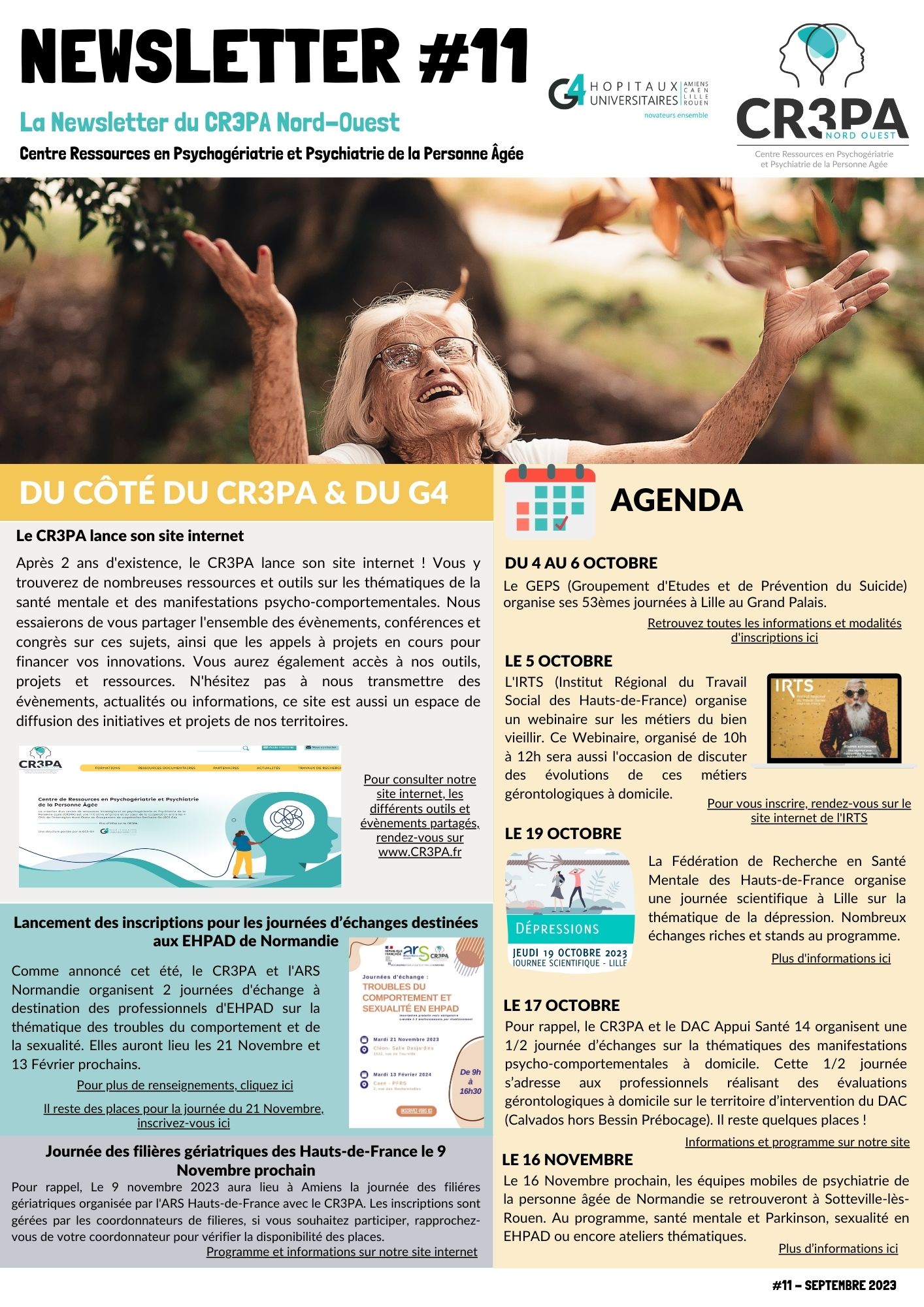 C’est avec plaisir que nous vous partageons la newsletter n°11 du CR3PA (Centre Ressources en Psychogériatrie et Psychiatrie de la Personne Âgée).